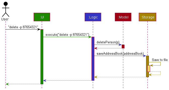 The Sequence Diagram below outlines how the components interact with each other, in a scenario where the user issues the command delete -p 87654321.