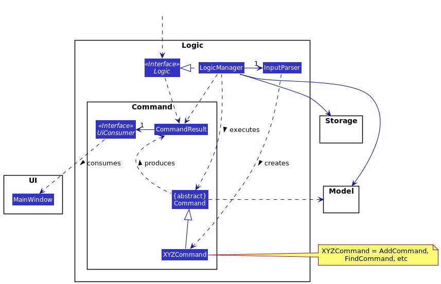 For example, the Logic component defines its API in the Logic.java interface and implements its functionality using the LogicManager.java class which follows the Logic interface. Other components interact with a given component through its interface rather than the concrete class (reason: to prevent outside component’s being coupled to the implementation of a component), as illustrated in the (partial) class diagram below.